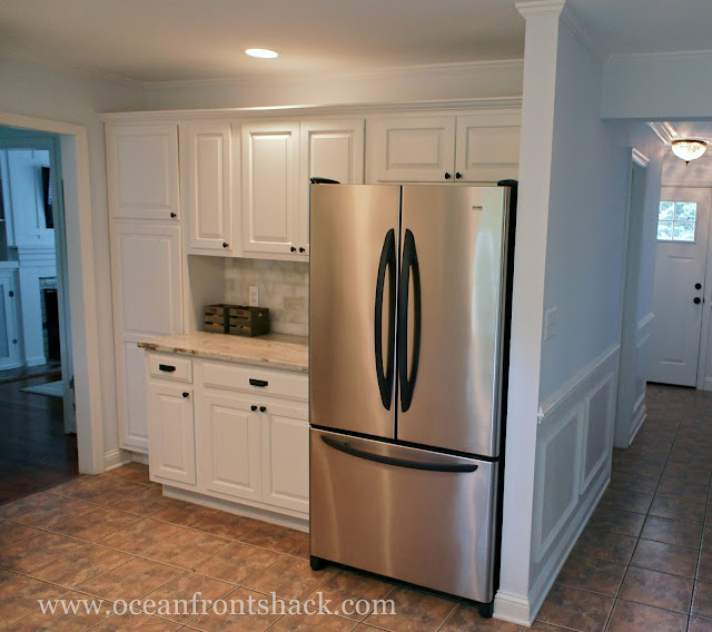 I painted the cabinets, we replaced the microwave with a range hood, changed out the cabinet hardware, tiled a new marble backsplash, and had granite countertops installed.