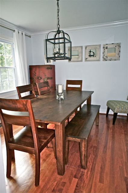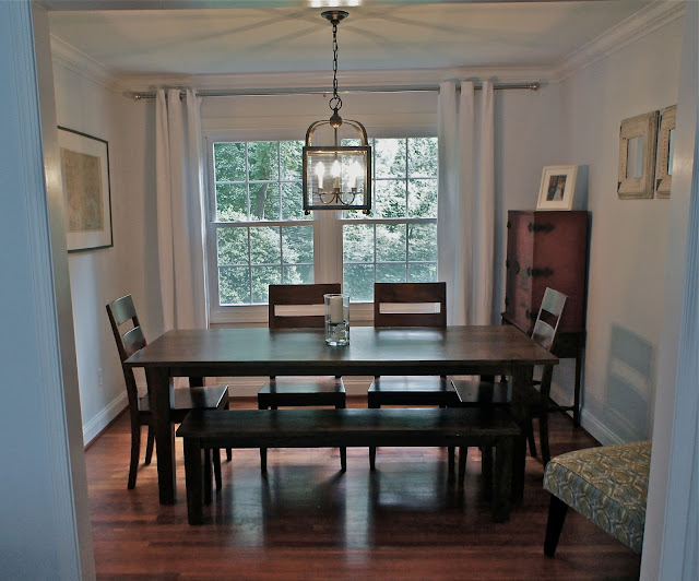 In the eat-in area of our kitchen, we replaced the ceiling fan with a pendant light fixture and built a shelving unit out of gas pipes and 1 x 12 for additional storage.